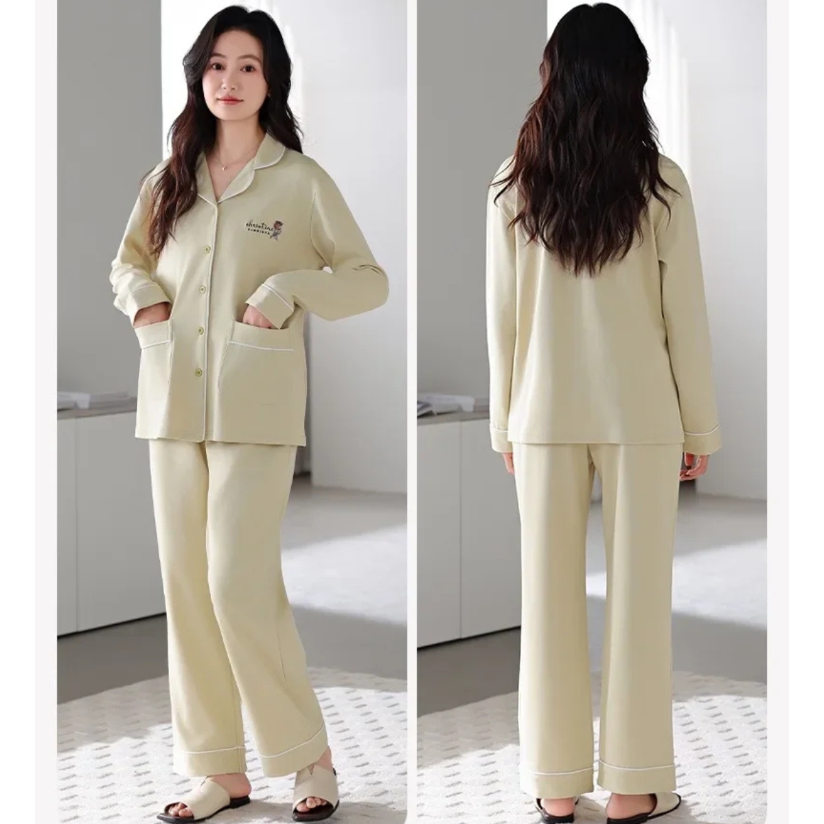 Pijamale create pentru confort și relaxare, realizate din materiale moi și plăcute la atingere. Design feminin, croială lejeră și finisaje atent alese, ideale pentru nopți liniștite și momente de răsfăț acasă. Lungime pantaloni: lungi; Lungime maneca: lunga; Guler: guler tip V; Material: bumbac 100%; Bucati: 2 buc. Important : Culoarea produsului poate varia ușor datorită luminozității monitorului. Din cauza varietății instrumentelor de măsură, pot exista ușoare erori de cm, informațiile de mai sus sunt aproximative.