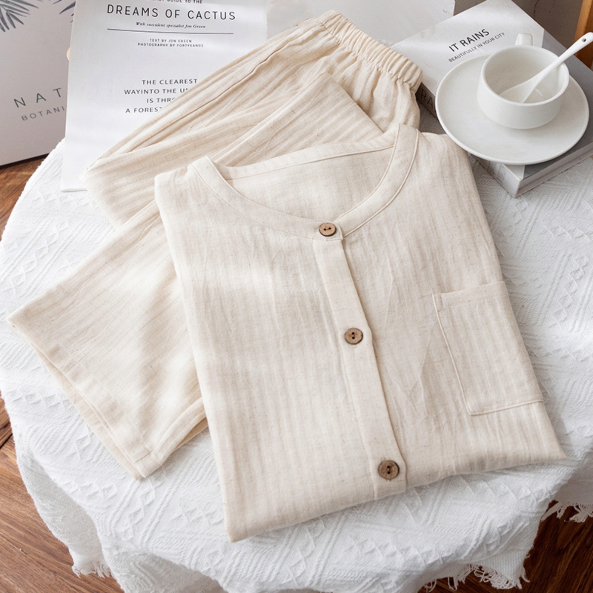 Pijamale create pentru confort și relaxare, realizate din materiale moi și plăcute la atingere. Design feminin, croială lejeră și finisaje atent alese, ideale pentru nopți liniștite și momente de răsfăț acasă. Lungime: lunga; Lungime maneca: cu maneci lungi; Guler: guler rotund; Stil: drept pe picioare; Material: bumbac 100%; Bucati: 2 buc. Important : Culoarea produsului poate varia ușor datorită luminozității monitorului. Din cauza varietății instrumentelor de măsură, pot exista ușoare erori de cm, informațiile de mai sus sunt aproximative.