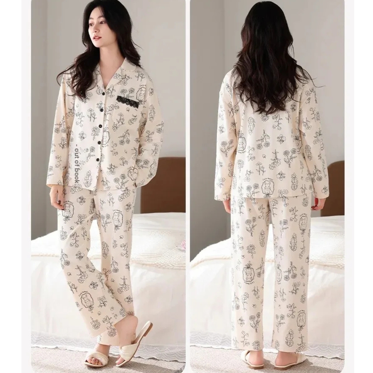 Pijamale create pentru confort și relaxare, realizate din materiale moi și plăcute la atingere. Design feminin, croială lejeră și finisaje atent alese, ideale pentru nopți liniștite și momente de răsfăț acasă. Lungime pantaloni: lungi; Lungime maneca: lunga; Guler: guler tip V; Material: bumbac 100%; Bucati: 2 buc. Important : Culoarea produsului poate varia ușor datorită luminozității monitorului. Din cauza varietății instrumentelor de măsură, pot exista ușoare erori de cm, informațiile de mai sus sunt aproximative.