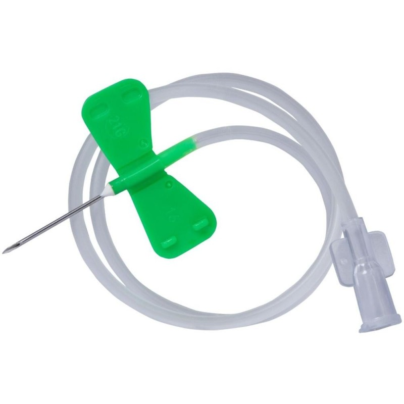 Microperfuzoarele cu ac (fluturasi) Prima sunt dispozitive medicale de unica folosinta, utilizate pentru administrarea sigura si precisa a solutiilor perfuzabile si a transfuziilor de sange. Datorita designului ergonomic cu aripioare laterale (tip fluturas), produsul permite o fixare stabila pe pielea pacientului si minimizeaza disconfortul in timpul insertiei. Fiecare microperfuzor este ambalat individual pentru mentinerea sterilitatii si este echipat cu un sistem de conectare Luer-Slip, ceea ce permite atasarea rapida si sigura la seringi sau linii de perfuzie. Tubul flexibil cu lungimea de 30 cm ofera o manevrabilitate superioara, reducand tensiunea asupra locului de insertie si permitand o pozitionare confortabila, mai ales in cazuri unde accesul venos este dificil. Setul contine 100 de microperfuzoare sterile, disponibile in marimi de la 20G la 27G, codificate pe culori pentru o identificare rapida: • Galben (24G) • Verde (21G) • Negru (22G) • Albastru (23G) • Mov (25G) • Portocaliu (20G) Avantaje principale: • Design cu aripioare flexibile pentru o fixare precisa si confortabila • Materiale de calitate: PVC medical, otel inoxidabil SS304 si polipropilena • Produs steril, netoxic si de unica folosinta • Ambalaj individual pentru siguranta maxima • Compatibil cu majoritatea seringilor si sistemelor de perfuzie cu conector Luer Alege microperfuzoarele cu ac fluturas Prima pentru siguranta, eficienta si confort sporit in orice procedura intravenoasa.