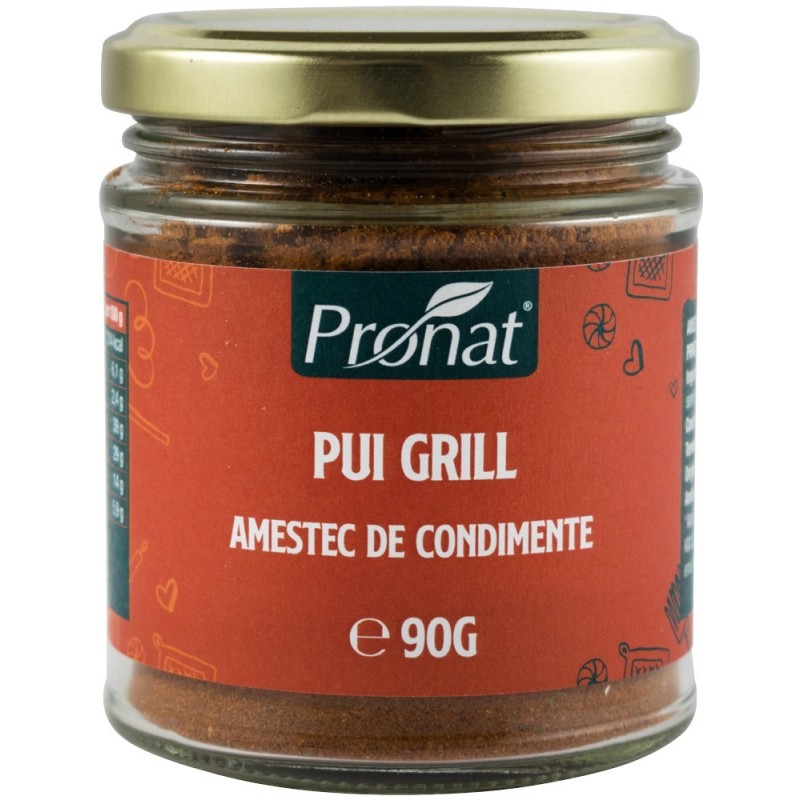 Acest pachet contine 2 bucati din produsul Amestec de Condimente pentru Pui Grill, 90 gPUI GRILL, AMESTEC DE CONDIMENTE, 90G Ingrediente: paprika, sare, nucsoara, ardei chili, seminte de schinduf, unsturoi, maghiran, patrunjel. Conditii de pastrare: loc uscat si racoros. Termen de valabilitate: a se vedea data inscriptionata pe ambalaj. Origine: Germania. Continut: 90g