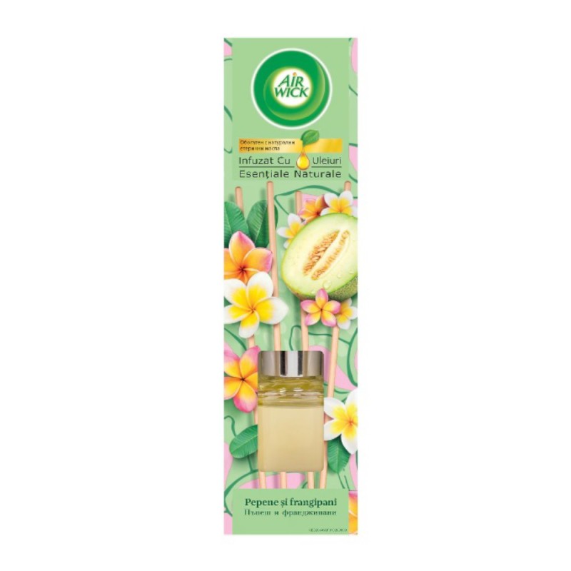 Acest pachet contine 2 bucati din produsul Odorizant de Camera cu Betisoare Parfumate Air Wick, Pepene Galben si Frangipani, 40 mlOdorizant de Camera cu Betisoare Parfumate Air Wick, Pepene Galben si Frangipani, 40 ml Lasati-va invaluiti de aroma pepenelui dulce si proaspat si de parfumul rafinat si exotic de frangipani. Odorizantul de camera cu betisoare parfumate Air Wick, pepene galben si frangipani este infuzat cu uleiuri esentiale naturale. Odorizantul de camera Air Wick cu betisoare de ratan dureaza pana la 4 saptamani. Intensitatea aromei poate fi reglata prin numarul de betisoare de ratan folosite: cu cat mai multe betisoare, cu atat mai intensa aroma.