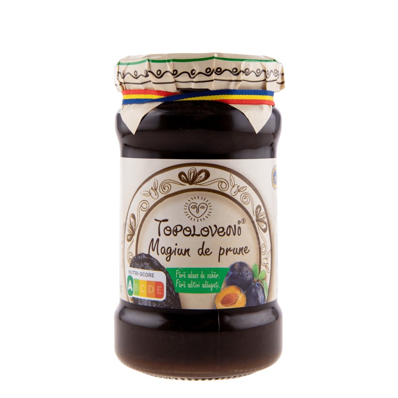 Magiun de Prune Topoloveni, 350 g Magiunul de prune Topoloveni este o pasta vascoasa (concentrata 5:1) de prune, usor tartinabila, care poate fi consumata fie ca atare (pe biscuiti, paine prajita, paine cu unt sau in combinatie cu iaurt, fulgi de cereale, inghetata etc.), fie ca desert in produse de patiserie (cornulete, gogosi, clatite etc.). Magiunul de prune Topoloveni este certificat de catre Institutul de Cercetari Alimentare drept aliment functional, care consumat in mod curent contribuie la mentinerea starii optime de sanatate, prin aportul de macroelemente, microelemente, macronutrienti, micronutrienti (fitonutrienti, in special antioxidanti, vitamine, fibre alimetare). Poate fi consumat de la varsta de 6 luni – cand incepe diversificarea alimentatiei; este permis si persoanelor bolnave de diabet (cu recomandarea medicului curant) – gratie indicelui glicemic scazut. Ingrediente: prune, (500g prune, pentru 100g produs finit), fara zahar adaugat, fara pesticide detectate.