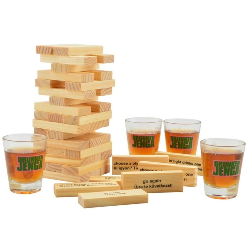 Distractivul Jenga de baut din lemn aduce voie buna la orice petrecere. Perfect ca idee de cadou sau pentru intalniri intre prieteni. Jenga de baut din lemn – joc alcoolic Clasicul joc Jenga reinterpretat intr-o varianta amuzanta de baut! Setul contine 60 de piese din lemn (7 x 2 cm) si 4 pahare din sticla de 3 cl. Ideal pentru petreceri, aniversari, intalniri intre prieteni sau ca idee de cadou. Se curata usor cu detergent lichid neutru. Cunoscut si ca: joc de baut, joc alcoolic, Jenga de petrecere. Atentie: jocul cu bauturi alcoolice este permis doar persoanelor peste 18 ani!