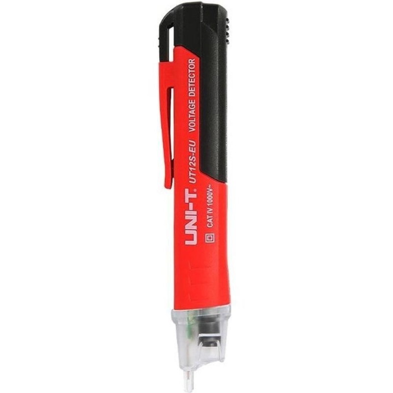 UT12S este un detector de tensiune AC fara contact realizat de UNI-T. Este delicat si usor de transportat. Se poate aplica casei, industriei sau departamentului electric pentru a determina rapid daca circuitul electric este incarcat sau nu. Intervalul de tensiune AC este de 90V ~ 1000V. Este destinat pentru a verifica prezenta tensiunii AC prin semnalizarea utilizatorului prin bip si semnalizarea intermitenta a LED-ului. Tensiunea AC: 90-1000 V AC Frecventa 50-60 Hz Afisare baterie descarcata Alimentare 2x AAA (R03) Indicator de joasa tensiune Test de cadere 1m Verifica tensiunea si nu prezenta conductorului, nu este detector de metale.