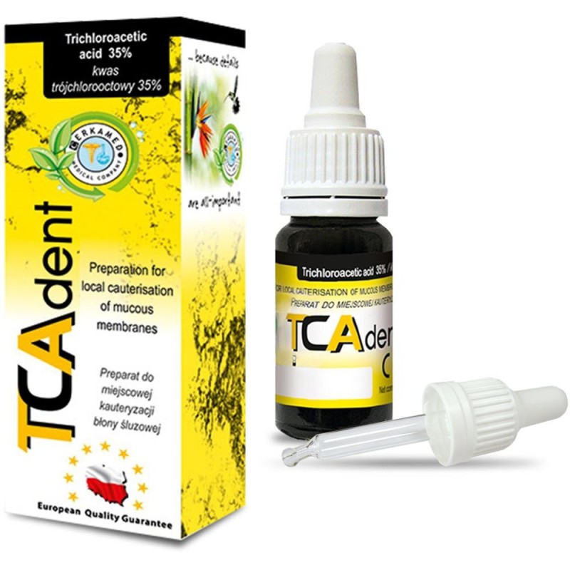 TCA Dent acid tricloracetic 35%, 10 ml solutie si 1 aplicator rezerva, este o solutie pentru cauterizarea locala a membranei mucoase.Avantaje:• Substante active: acid tricloracetic 35%, apa purificata Ph Eur, aroma;• Accelereaza vindecarea;• Opreste sangerarea;• Disponibil in flacoane de 10ml, cu aplicatoare de unica folosinta.Indicatii:• Pentru cauterizarea schimbarilor patologice locale si a sangerarilor minore din cavitatea orala;• Ajuta la vindecarea leziunilor granulate, efectul de vindecare fiind obtinut prin coagularea chimica a tesutului alterat patologic.