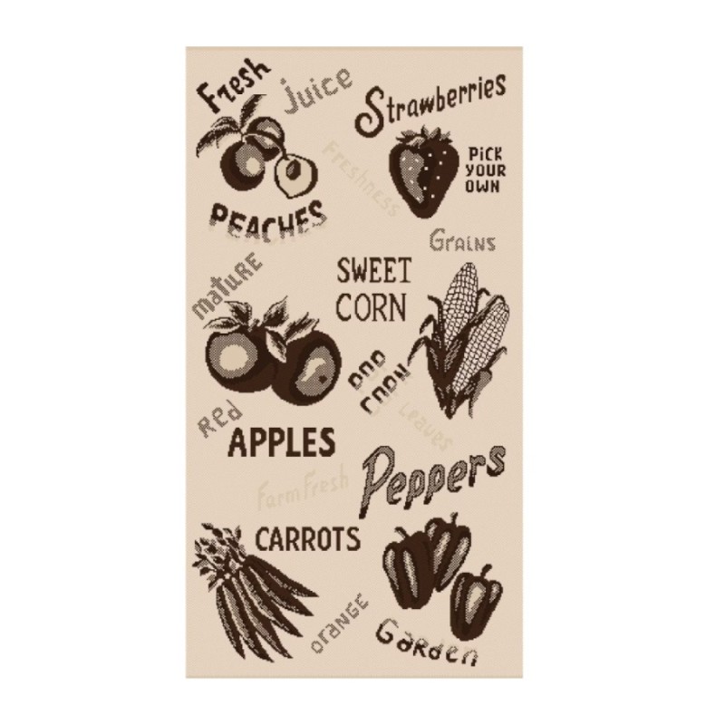 Un covor de tip iuta, care poate fi folosit cu dedicatie in bucatarii dar, si in holuri sau balcoane. Intretinerea covorului este la indemana tuturor. Se curata foarte usor cu aspiratorul sau matura. Colectia Natura prezinta covoare cu tesatura plata. in timpul procesului de productie, firele sunt tesute intr-un mod special, creand modele si texturi unice ale covoarelor. Sunt folosite materii prime de inalta calitate si echipamente moderne pentru a produce covoare impecabile si fiabile. Caracteristici: - Inaltime fir: Tesatura plata - Design: Modern, Natura Fruits and Veggies - Tip tesatura: Tesut la masina - Rezistent la trafic intens si la pardoseli incalzite - Densitate totala (g/m2): 1500 - Forma: Dreptunghi - Material: 100% Polipropilena