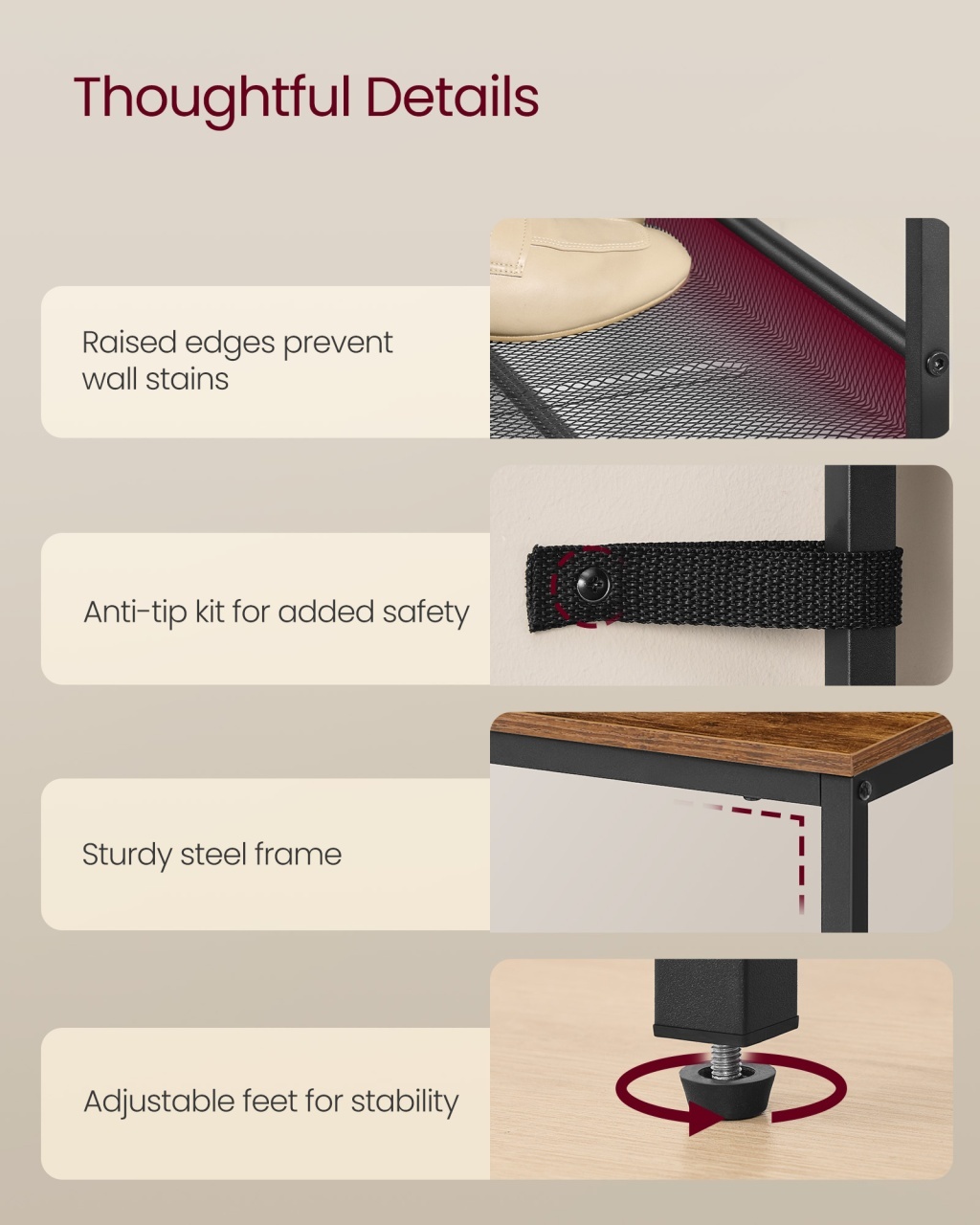 Pantofar Vasagle Maro 28x75x53 cm - Organizare Stilată și Robustă Design modern și materiale de calitate Acest pantofar îmbină perfect estetica rustică a PAL-ului melaminat cu finisajul maro vintage și structura solidă din metal vopsit în negru. Designul său industrial aduce un plus de stil în orice hol, transformând o piesă utilitară într-un element de decor atractiv. Calitatea materialelor asigură o durabilitate extinsă, cadrul metalic oferind stabilitatea necesară pentru utilizarea zilnică intensă. Funcționalitate și organizare Cu o capacitate de stocare pentru 6-9 perechi de pantofi , acest organizator este extrem de versatil. Cele două polițe din plasă metalică sunt ajustabile , putând fi montate drept sau înclinat pentru a acomoda diverse tipuri de încălțăminte, de la teniși la botine sau pantofi cu toc. Blatul superior este extrem de rezistent, suportând o sarcină de până la 136 kg , ideal pentru a așeza genți sau cutii de depozitare, în timp ce marginea posterioară ridicată protejează peretele de murdărie. Montaj și întreținere Produsul se livrează demontat, însă asamblarea este rapidă datorită pieselor numerotate și a instrucțiunilor clare. Pachetul include un kit anti-răsturnare pentru siguranță sporită, fixând raftul ferm de perete. Suprafața din PAL și metal se curăță ușor cu o cârpă umedă , menținând aspectul impecabil fără efort. Picioarele sunt reglabile pentru a compensa micile denivelări ale podelei. Comandă acum Comandă acum pentru a transforma Holul cu stil și eficiență! Detalii tehnice complete Dimensiuni și greutate Dimensiuni produs: 75 x 28 x 53 cm Greutate produs: 5.5 kg Materiale și caracteristici Material cadru/corp: Metal / PAL melaminat Culoare: Maro rustic / Negru Sarcina maximă blat: 136 kg Sarcina maximă poliță: 11 kg Montaj și pachet Stare asamblare: Neasamblat Conținut pachet: 1 x Pantofar, accesorii montaj, kit anti-răsturnare, schiță Stil și origine Stil: Industrial / Rustic Destinație recomandată: Hol Comandă acum Adaugă în coș și organizează-ți încălțămintea cu eleganță!