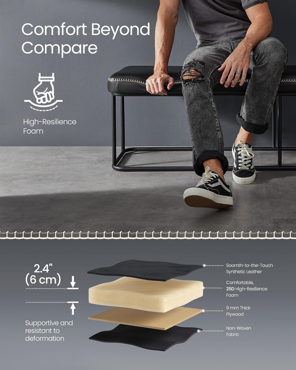 [Imbunatateste-ti spatiul] Descopera bancheta de intrare VASAGLE EKHO Collection, unde pielea sintetica intalneste cusaturile rafinate. Marginile sale subtile curbate dau prioritate sigurantei, in timp ce liniile metalice elegante contribuie la iluzia de spatiu suplimentar [Robusta si durabila] Aceasta banca de capat de pat, realizata din materiale de calitate superioara si sustinuta de un cadru de otel robust, este construita pentru a rezista in timp. Sustine cu incredere pana la 300 kg (660 lb), asigurandu-va ca sunteti intotdeauna pe maini sigure [Confort in fiecare pozitie] Glisati mana pe husa neteda, apoi scufundati-va in spuma de sustinere de 6 cm (2,4"), cu o grosime de 6 cm (25D), cu rezistenta ridicata. Aceasta banca captusita ofera un scaun confortabil care rezista, trecand testul timpului fara sa se deformeze [Fie ca serveste ca o masa de cafea fermecatoare in camera de zi, o banca de pantofi in hol, o banca confortabila in dormitor sau un scaun suplimentar elegant in dulapul dvs., acest scaun tapitat se adapteaza perfect la toate nevoile dvs. [Asamblare fara efort, ingrijire usoara] Nu numai ca banca pentru dormitor este usor de asamblat, dar este, de asemenea, confectionata din piele sintetica rezistenta la uzura, care este usor de intretinut. Urmati pur si simplu instructiunile clare pentru a atasa picioarele si sunteti gata