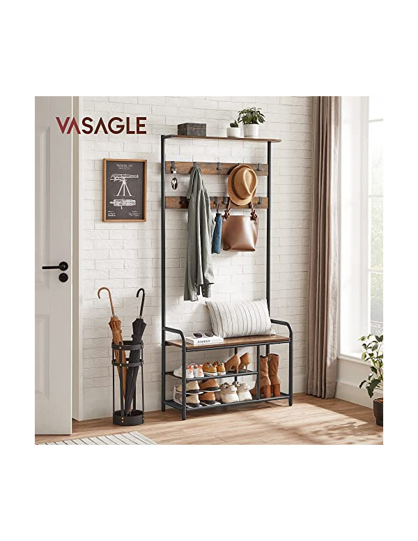 Cuier cu bancuta si suport pantofi Model Benjamin, Maro Rustic/Negru, 85x30x180.5 cm