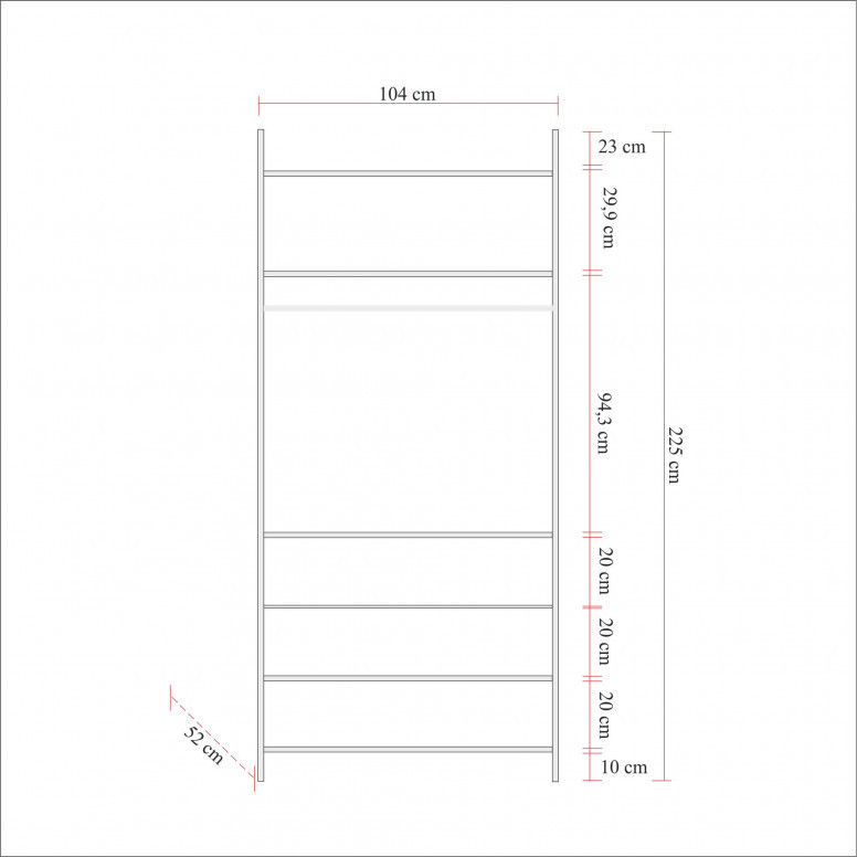 Transformă-ți spațiul cu un dulap modern și elegant Te-ai săturat de dezordine și dezorganizare în dormitorul tău? este timpul să faci un upgrade la dulapul nostru uimitor care nu numai că va oferi o depozitare amplă, dar va adăuga și o notă de eleganță spațiului tău. Calitate și durabilitate de neegalat Confecționat din panouri de particule acoperite cu 100% melamină, dulapul nostru este construit pentru a dura. Grosimea de 18 mm asigură robustețe și longevitate, în timp ce bordurile din pvc adaugă un finisaj elegant. Picioarele metalice asigură stabilitate și suport, ceea ce îl face o alegere de încredere pentru anii următori. Maximizați spațiul de stocare Cu două sertare spațioase și numeroase rafturi, dulapul nostru oferă o mulțime de spațiu pentru a vă păstra organizate hainele, accesoriile și alte lucruri esențiale. Înălțimea raftului superior de 29. 9cm și înălțimea raftului inferior de 20cm permit aranjarea ușoară a diferitelor articole. Înălțimea sertarului de 20cm oferă spațiu de depozitare suplimentar pentru articole mai mici. Design versatil și practic. Dulapul nostru poate fi fixat cu ușurință pe perete, asigurând stabilitate și siguranță. Culoarea Atlantic Pine adaugă o notă de rafinament oricărei încăperi, ceea ce îl face perfect pentru spațiile moderne și cu tematică industrială. Dimensiunile sale de 104 cm lățime, 225 cm înălțime și 52 cm adâncime îl fac potrivit pentru diverse dimensiuni de cameră. Detalii tehnice: Tip de produs: Dulap Material: Material: Panou de particule de lemn acoperit cu melamină 100%. Grosime: 18mm Bordură: PVC Picioare: Metal, înălțime de 10 cm Dimensiunea dulapului: Lățime: 104cm, Înălțime: 225cm, Adâncime: 52cm Înălțimea raftului superior: 29. 9cm Înălțimea raftului inferior: 20cm Înălțimea sertarului: 20cm Culoare: Pin Atlantic Concepție: Culoare: Atlantic Pine: Modern - Noutate, Industrial