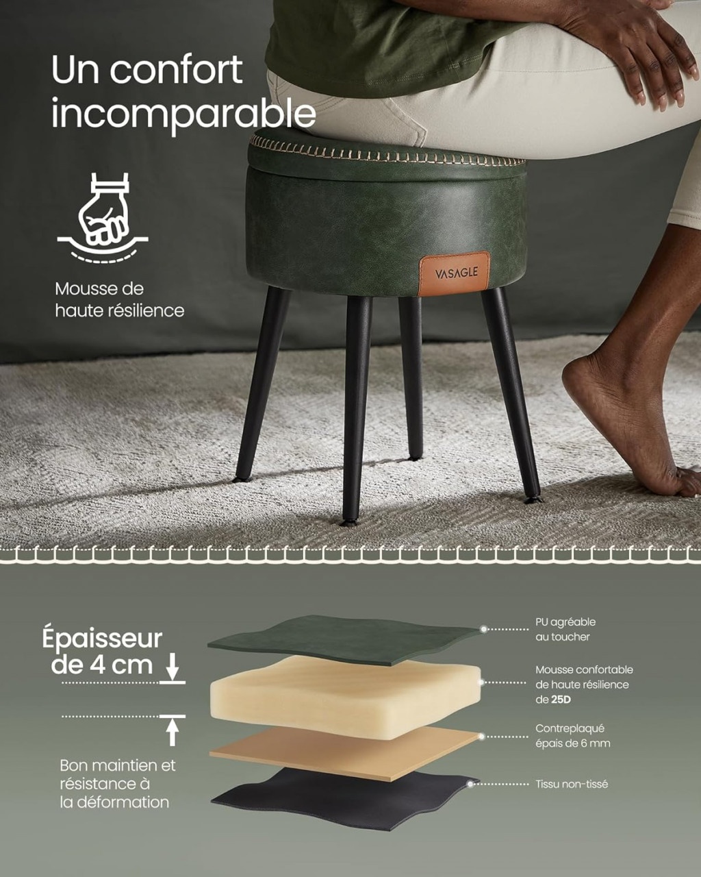 [Farmec si versatilitate] Aceasta piesa de mobilier poate fi folosita ca taburet pentru masuta de toaleta, ca suport de picioare pentru fotoliu sau pur si simplu ca masuta laterala prin rasturnarea partii superioare. Cu un volum de 9,4L, este perfect pentru a va depozita obiectele mici [Impodobiti-va spatiul] Admirati aceasta combinatie de PU, cusaturile rafinate si picioarele conice ale acestui otoman de depozitare din colectia VASAGLE EKHO, un omagiu concret adus spiritului artizanal, care va ridica locuinta pe noi culmi de eleganta. [Facut pentru a rezista] Acest taburet de masa de toaleta este fabricat din 4 picioare din otel robust si este intarit cu un perete gros de 1,2 mm. Echipat cu picioare reglabile articulate, acesta poate sustine pana la 150 kg, asigurand o durata de viata lunga [Confort la fiecare scaun] Treceti mana peste invelisul neted si scufundati-va in spuma de inalta rezistenta 25D de 4 cm grosime. Acest taburet de depozitare ofera scaune confortabile care rezista in timp, fara a-si pierde forma [Usor de asamblat si de curatat] Instalarea este o joaca de copii: atasati pur si simplu picioarele si sacul dvs. de fasole va fi o declaratie. In plus, suprafata sa din PU de calitate il face usor de curatat si ramane impecabil cu un efort minim. Caracteristici : Culoare: Verde pădure Materiale: Otel, Spuma Poliuretanica, Placaj; Dimensiuni 38,2 x 44,4 cm (⌀ x H) Diametrul scaunului: 32 cm Greutate: 3,3 kg Capacitate maximă de încărcare statică: 150 kg Livrare : 1 x Ottoman de depozitare 1 x Kit de montare 1 x Instrucțiuni de utilizare