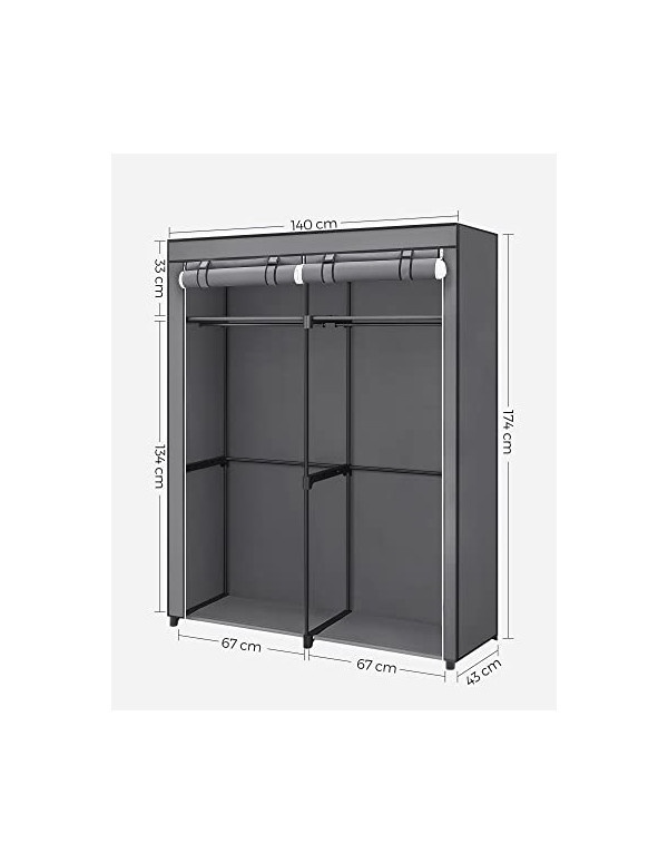 [Spațios pentru o bună organizare] Agățați hainele cu grijă pe cele 2 bare pentru haine și așezați-vă gențile, șepcile și șosetele pe cele două rafturi reglabile. Totul își găsește locul în acest dulap spațios [Are rezistență] Șinele de agățat cu grosimea de 0,4 mm au o capacitate de încărcare de 30 kg fiecare, iar raftul pentru țesături rezistă până la 10 kg, deoarece este susținut de patru tuburi metalice cu diametrul de 16 mm și conectori dublu-față consolidați [Protecție fără praf] Noul dvs. articol de îmbrăcăminte preferat are nevoie de o protecție mai bună. Husa din țesătură, echipată cu fermoar și închizătoare cu cârlig și buclă, a fost aleasă manual pentru a vă depozita hainele în mod corespunzător. Acest suport pentru haine vă protejează! [Asamblare ușoară] Conectorii sunt toți la fel. Nu este nevoie să le identificați și nu sunt necesare unelte; doar atașați tuburile la conectorii din plastic și gata! [Ce primiți] Un dulap confecționat din material nețesut de înaltă calitate, cu șine de agățat și rafturi - o modalitate optimă de a scăpa de haosul hainelor chiar și într-un apartament mic •Specificatii: •Culoare: Gri •Dimensiuni: 140 x 43 x 174 cm (L x W x H) •Greutate: 5.4 kg •Pachetul contine:1 x Dulap din stofă- 1 x Instrucțiuni (EN, DE, FR, ES, IT)