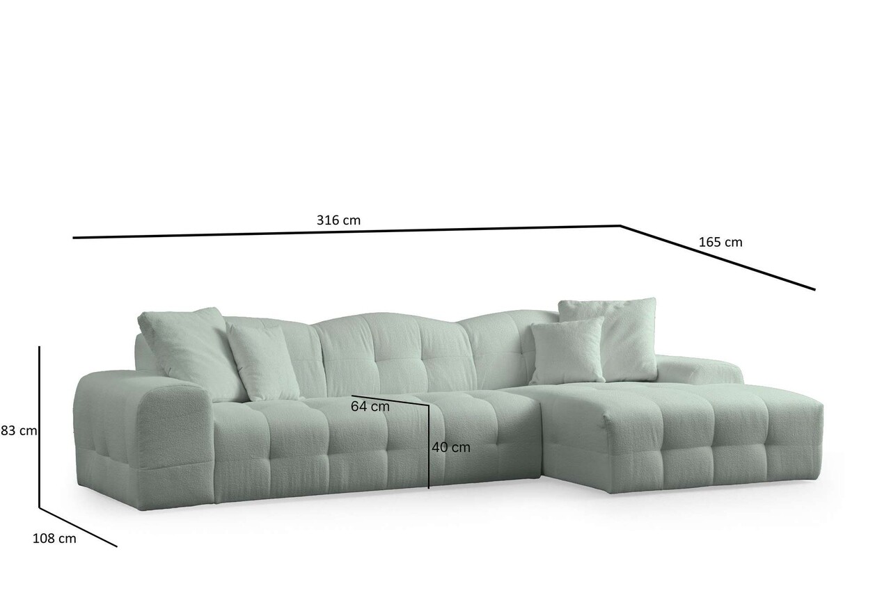 ColtarTesatura: PoliesterLungime: 316 x 165 cm Latime: 108 cm Inaltime: 83 cmSpuma: 28 DNS spumă moale gri / 24 DNS Feather60% spumă tăiată / 40% spumă de silicon pentru spatePerne: 3 perne inclusePicioare: Picioare din plastic negru (3 cm)Inaltime sezut: 40 cmAdancime sezut : 64 cmInaltime cotiera: 54 cmLățimea cotierei: 30 cm